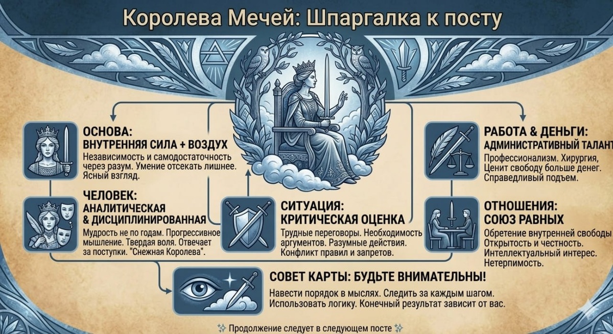Королева Мечей Продолжаем наш цикл разборов! Мы уже изучили основательную Королеву Пентаклей, а сегодня переходим к самой проницательной, независимой и интеллектуальной героине — Королеве Мечей. Это энергия ясного ума, освобождения и железной логики. Основа карты Королева — это внутренняя сила, сохранение границ, управление и зрелость. Мечи — стихия Воздуха: интеллект, идеи, коммуникация, анализ и умение отсекать лишнее. Если соединить эти значения, получается формула: Независимость и самодостаточность, достигнутые через силу разума. Это не про мягкость или уют. Это про умение отделять эмоции от фактов, выходить из зависимости и смотреть правде в глаза, какой бы холодной она ни была. Королева Мечей точно знает: свобода начинается там, где заканчиваются иллюзии. Если карта показывает человека Королева Мечей — это воплощение дисциплины и острого ума. Обычно это личность 30–45 лет, но если карта выпадает молодой девушке — перед вами человек, мудрый и умный не по годам. Это женщина (