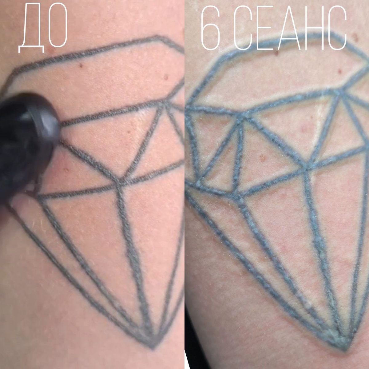 👀 На фото — татуировка до и результат после 6 сеансов лазерного удаления. И вот здесь очень показательный пример: татуировка вроде бы небольшая, кажется — “ну что там выводить?”. Но на практике свежие татуировки, которым год и меньше, часто выводятся сложнее, чем старые. Почему так происходит? Свежий пигмент ещё плотный, насыщенный, компактно лежит в коже. Он не успел со временем “разрыхлиться”, частично посереть, потерять плотность и стать более податливым для лазера. Проще говоря: старый пигмент уже немного “устал”, а свежий ещё держится крепко. Лазер не стирает татуировку как ластик. Он разбивает пигмент на более мелкие частицы, а дальше организм постепенно выводит их через лимфатическую систему. Поэтому результат зависит не только от аппарата, но и от: — плотности забивки; — состава пигмента; — глубины внесения; — возраста татуировки; — зоны на теле; — индивидуальной реакции организма. Что я вижу по этой работе? Тенденция есть хорошая: пигмент стал более холодным, серо-син
