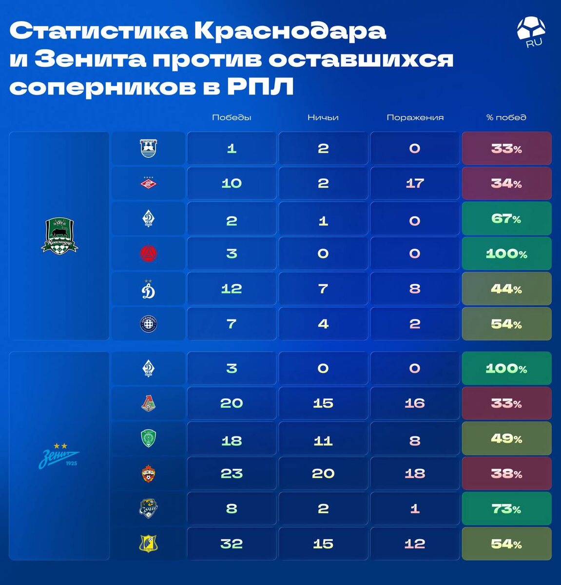 Статистика «Краснодара» и «Зенита» против оставшихся соперников в чемпионате