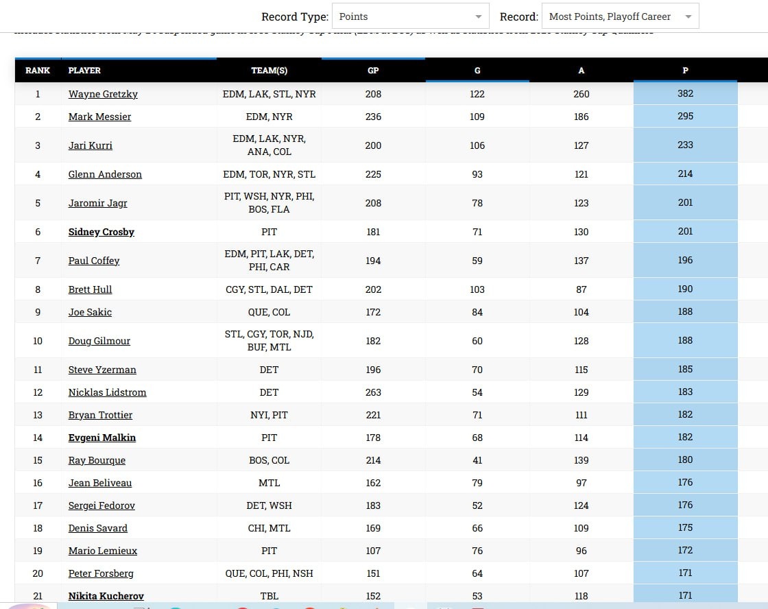 Евгений Малкин поднялся на 14-е место по очкам в плей-офф за всю историю