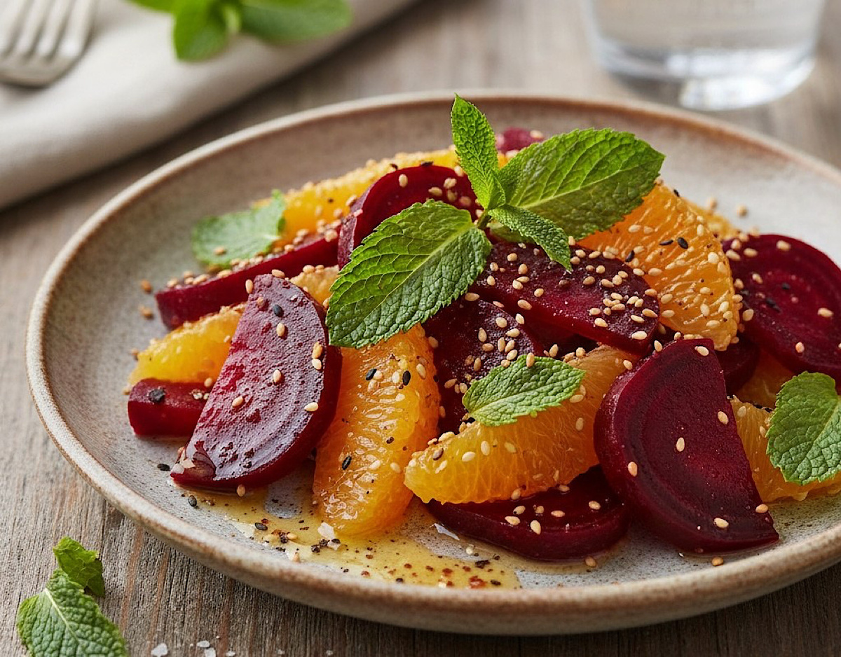 Апельсин и свекла — классика Восточного Средиземноморья. Мята меняет всё: салат перестает быть «землистым» и становится танцующим.