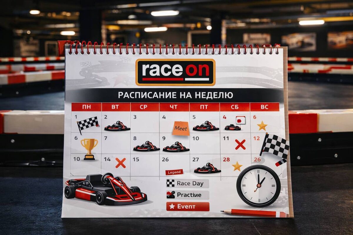 ) ПОНЕДЕЛЬНИК: • Клубный час: 20:30, 20:45, 21:00, 21:15 • Взрослая группа "Новички" (ROK RACING Academy™). Время сбора 21:00 Старт в 21:30 ВТОРНИК: • Клубные заезды: 13:30, 14:00, 14:30 ⚠️ Клубные заезды REVERSE: 20:00, 20:30, 21:00 • PRO ROK 8 REVERSE: 21:30–23:00 PRO ROK - еженедельные соревования для любителей и профи(с наличием клубных лицензий) с призами и сертификатами. Гонка проводится с пит-стопом. Возраст от 16-ти лет. Формат: Квалификация ➡️ Гонка со сменой карта(55 кругов) Регистрация откроется сегодня (Воскресенье, 19.04.2026) в 17:00 СРЕДА: • Клубные заезды: 13:30 14:00, 14:30, 19:00, 19:30, 20:15 • Взрослая школа "ПРО" (ROK RACING Academy™): 20:30–22:30 ЧЕТВЕРГ: • Клубные заезды: 13:30, 14:00, 14:30, 19:00, 19:30, 20:15 • РЕЙН РОК - 21:30-23:00 РЕЙН РОК - Ежемесячные соревнования для новичков и любителей с призами и сертификатами. Гонка проходит по влажным условиям. Формат: Квалификация ➡️ Дождевая Гонка(44 круга) Возраст от 16-ти лет. Регистрация откроется сегодня (