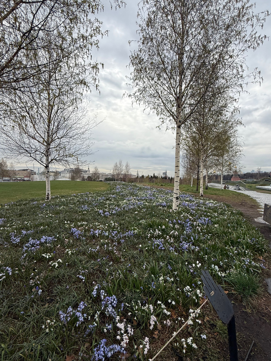 Сегодня мы зашли в парк со стороны улицы Варварка. Перед амфитеатром поляна первоцветов. Жаль, крокусы уже отцвели, но остались другие, не