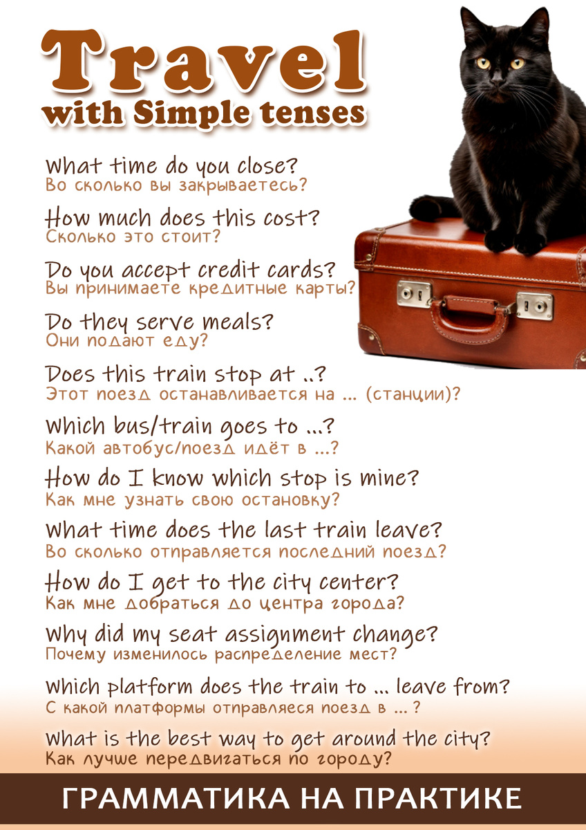 Когда мы путешествуем, нам часто нужно узнать про расписания, транспорт или работу гостиниц. Для этого нужны Present Simple или Past Simple. Повторить грамматику, связанную с ними можно в этих видео: https://dzen.ru/video/watch/660829282055982e121e8ca0, https://dzen.ru/video/watch/6608291333fad83804091905, https://dzen.ru/video/watch/66087416b1265e7fba8a2c0b