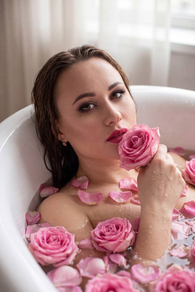 Сцена — женщина в ванне, окружённая лепестками и розами. Объект съёмки (женщина): расположена в центре кадра, погружена в ванну по плечи; смотрит прямо в камеру — взгляд прямой, выразительный, с лёгкой загадочностью; лицо обрамлено мокрыми волосами, спадающими на плечи; кожа гладкая, без веснушек, с естественным тоном, подсвечена мягким светом; макияж выразительный: чётко очерченные брови, дымчатые тени на веках, длинные ресницы, губы покрыты насыщенной помадой, гармонирующей с цветом роз; правая рука поднята к лицу, держит крупную розовую розу, которую женщина подносит к губам; ногти аккуратные, с лёгким маникюром, не отвлекающим от общего образа. Ванна и вода: ванна белая, с плавными закруглёнными формами, занимает большую часть фона; вода в ванне прозрачная, с лёгким блеском, отражающим свет; на поверхности воды — множество розовых лепестков и целых роз, распределённых равномерно, создающих романтическую атмосферу; лепестки и розы должны быть прорисованы с высокой детализацией — вид