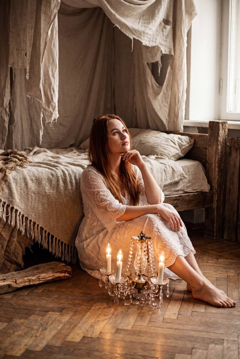 деревянном паркете у кровати, задумчиво смотрит вверх, одна рука у подбородка. Интерьер бохо с рваными льняными тканями, покрывалом с бахромой, грубой текстурой; хрустальная люстра с горящими свечами у её ног. Тёплый свечной свет в сочетании с мягким боковым дневным освещением, глубокая малая глубина резкости, теплые тона, контрастные полутени, тонкая зернистость, детализированные текстуры, романтичное, слегка меланхоличное настроение. Формат 9:16