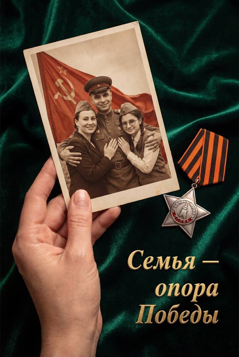 Глубокий художественный кадр, 3:4. Рука женщины держит семейную открытку: на ней изображены счастливые отец в форме, мать и один ребенок (девочка 16 лет. , обнимающиеся на фоне знамени. Рука лежит на бархатной темно-зеленой ткани. Рядом — Орден Славы. Текст золотой вязью: «Семья — опора Победы». Монументально и торжественно.
