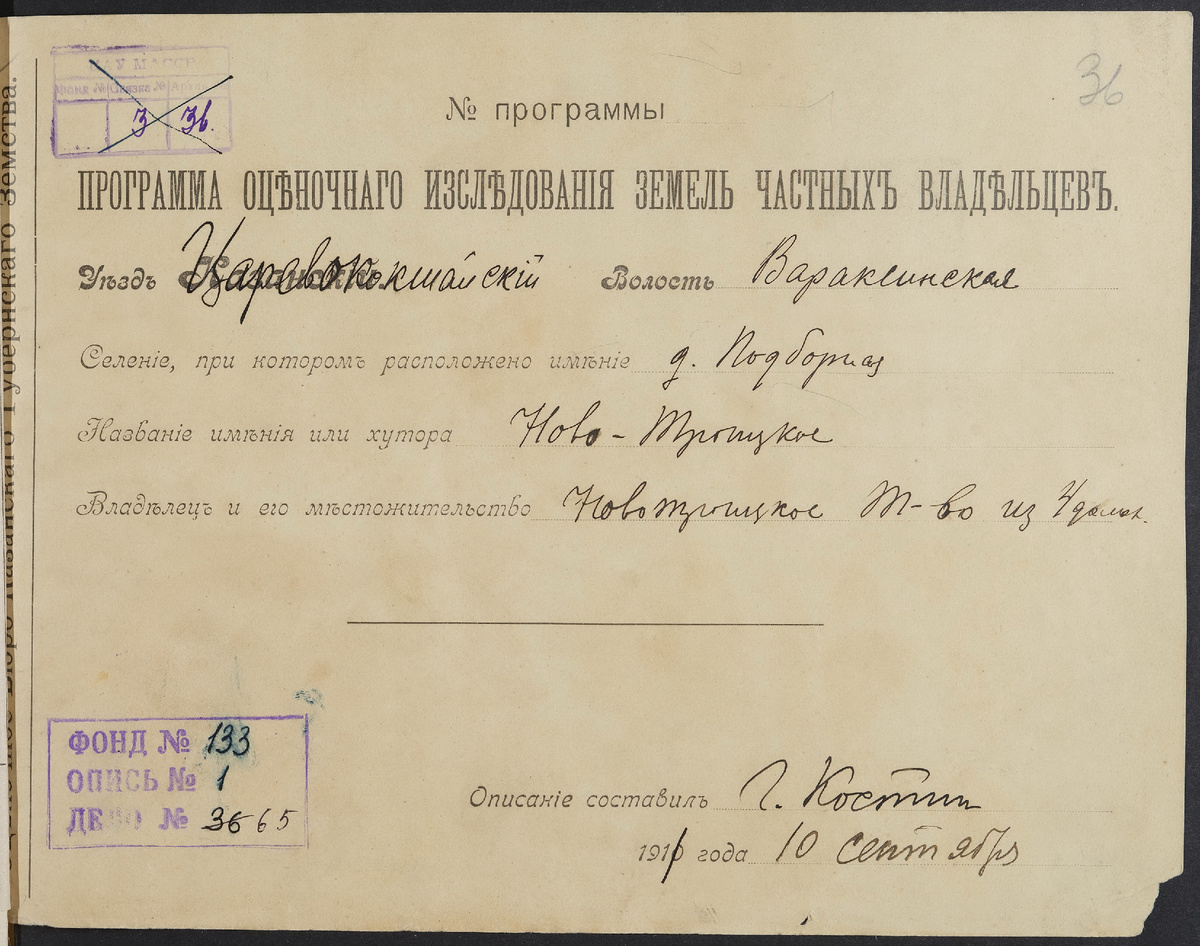 Государственное бюджетное учреждение «Государственный архив Республики Марий Эл». Фонд № 133 Опись № 1 Дело № 3635. Лист 1. Программа оценочного исследования земель частных владельцев. Уезд Царевококшайский. Волость Вараксинская. Селение, при котором расположено имение: д. Подборная. Название имения или хутора: Ново-Троицкое. Владелец и местожительство: Новотроицкое товарищество из 4-х домов. Описание составил Г. Костин. 1911 года 10 сентября. Лист 23. Уезд Царевококшайский. Волость Вараксинская. Земельная община. Наименование владельцев. Короткова Елизавета Петровна, вдова купца Мариинского посада. Местонахождение владения. - при д. Подборной, бывшей Юферовой, за рекой Ульяновой. Леса строевого и дровяного - 65. - при оной же деревне. Леса строевого и дровяного – 116 /2354. - при пильной мельнице на реке Малой Кокшаги. Леса строевого и дровяного – 8. * - при пильной мельнице на реке Кундыше около станции. Леса строевого и дровяного – 8. - при пильной мельнице на реке Кундыше около дер