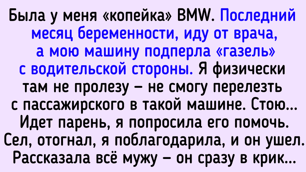 Была у меня «копейка» BMW. Последний месяц беременности, иду от врача, а мою машину подперла «газель» с водительской стороны. Я физически там не пролезу — не смогу перелезть с пассажирского в такой машине. Стою. Идет парень, я попросила его помочь. Сел, отогнал, я поблагодарила, и он ушел. Рассказала мужу — он сразу в крик: «А если бы он угнал?!» А я об этом даже не подумала.