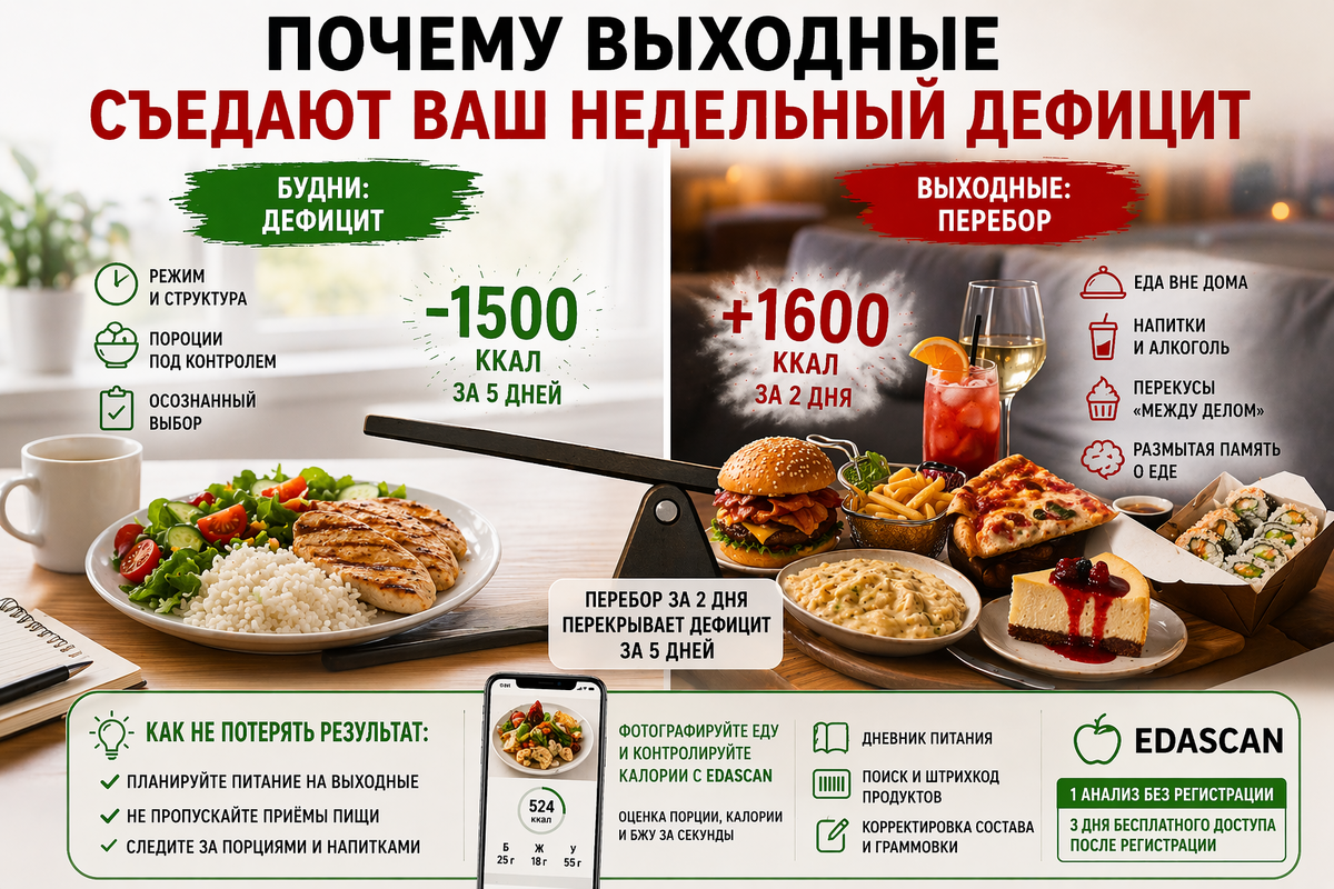 В этом и есть главная ловушка выходных. Они редко ломают результат одним большим перееданием. Гораздо чаще всё портят мелочи, которые по отдельности кажутся совершенно нормальными.