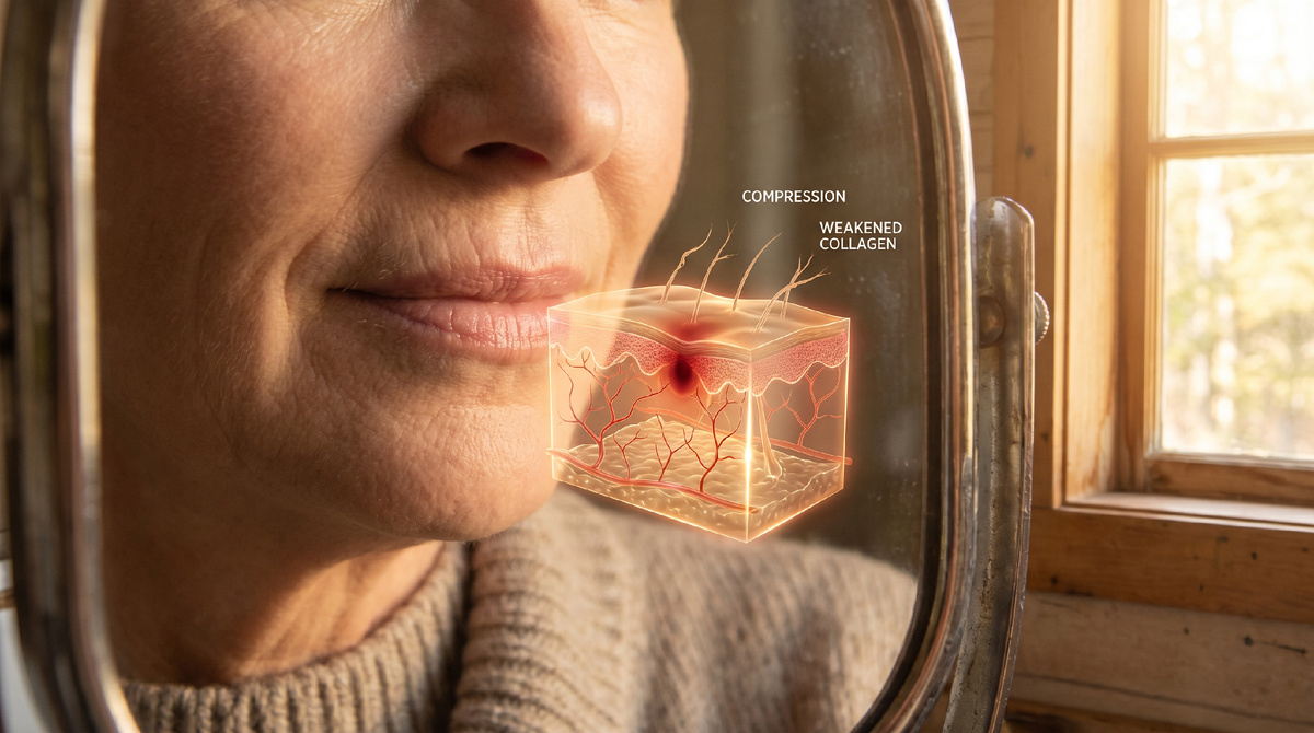 Уголок рта - точка максимального механического напряжения на лице. Кожа здесь растягивается при каждом слове, каждом жевании, каждом глотке. За день - сотни циклов растяжения и возврата. Ткань в этой точке должна быть эластичной и быстро восстанавливаться после нагрузки.