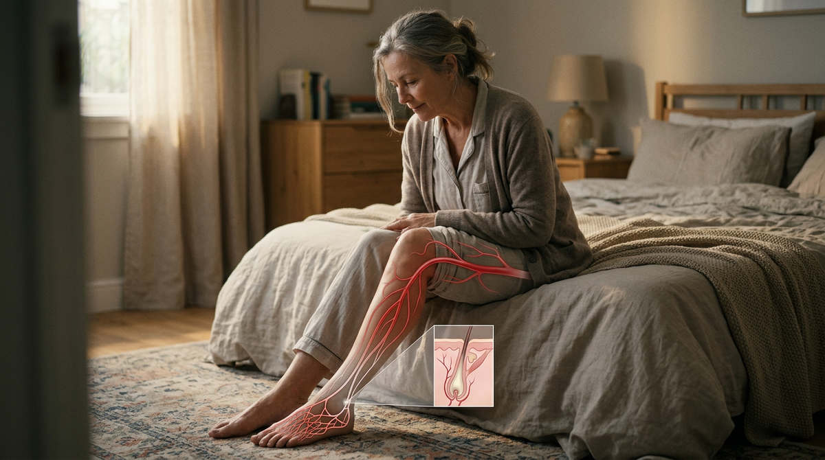 Когда волосы исчезают с тыльной стороны стопы, с пальцев ног, с нижней трети голени - и при этом выше, на бедре, они есть - это не гормоны. Это карта кровоснабжения.