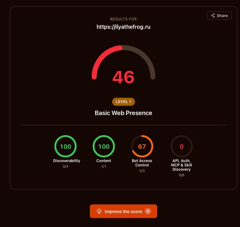 Cloudflare выпустило инструмент, который проверяет, готов ли сайт к ИИ-агентам: https://isitagentready.com/ilyathefrog.ru В первой проверке было 25 баллов, пришлось срочно исправляться, потратил все токены) 👨💻Продакт поехал #ai #personal