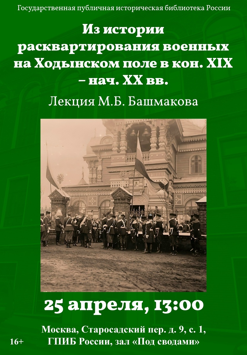 ИЗ ИСТОРИИ РАСКВАРТИРОВАНИЯ ВОЕННЫХ НА ХОДЫНСКОМ ПОЛЕ В КОН. XIX – НАЧ. XX ВВ В лекции Михаила Борисовича Башмакова, к.и.н., заведующего научно-просветительским отделом ГПИБ России речь пойдет об исторической территории современной части Западного административного округа г. Москвы – Ходынском поле, а также их окрестностях с середины XIX и до начала XX века, где на протяжении данного отрезка времени расквартировывались различные военные организации и учреждения. Известно, что Ходынский лагерь был создан в первой половине XIX века как место лагерной стоянки расположенных в Москве и её окрестностях войск. Xодынские военные лагеря располагались в восточной части поля, а в его западной части были оборудованы артиллерийский полигон и стрельбище. В конце XIX века на Ходынском поле были построены Николаевские казармы. В них расположились Первый Донской казачий полк и Первая артиллерийская гренадёрская бригада. В 1909 г. началась авиационная часть истории Ходынского поля, демонстрационных по
