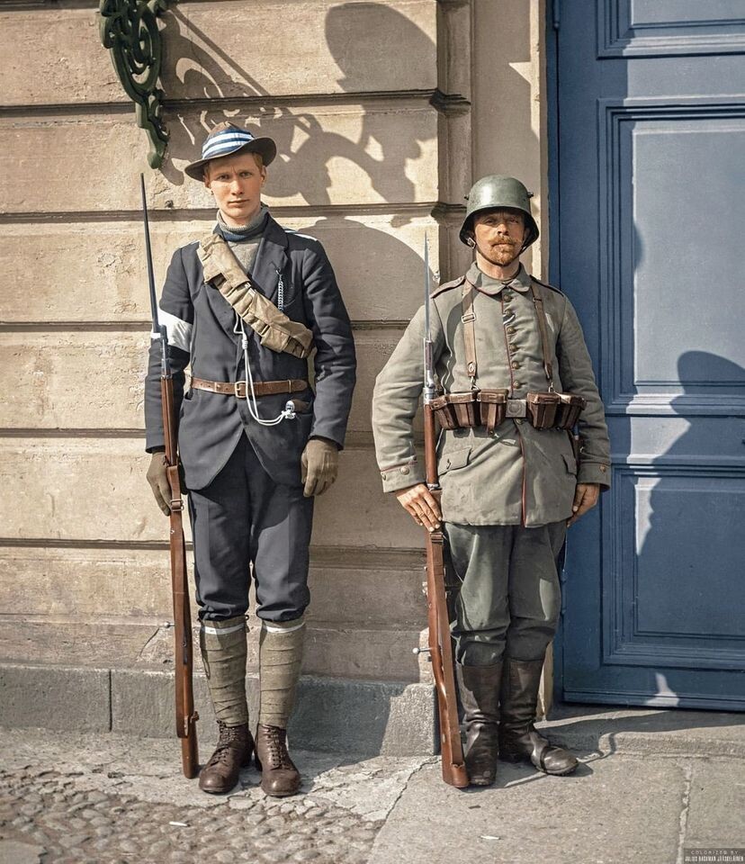 Финский гвардеец и немецкий солдат возле шведского театра, Хельсинки, 19 апреля 1918 года