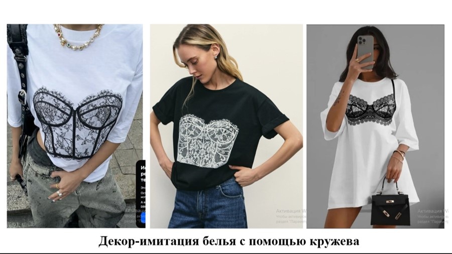 Украшение футболок кружевом - модный тренд. Декорированная футболка приобретает черты романтичного стиля и становится нарядной и женственной. Маркетплейсы предлагают достаточные количество вариантов уже готовых, облагороженных изделий. Что же именно представлено в продаже? Я попыталась выделить основные приёмы использования кружевного декора в готовых моделях. Во-первых, выполненные с помощью кружева элементы белья на футболках. Такие аппликации придают майке сексуальности, разрушая представление о ней, как об одежде без половой принадлежности. Во-вторых, использование кружевных вставок. От аппликации вставка отличается тем, что кружево нашивается не поверх ткани, а вместо неё. В-третьих, использование кружева для отделки края футболки. Третий вариант показался мне несложным и вдохновил меня на творчество. Я купила футболку оверсайз из плотного хлопка молочного цвета. Посчитала важным, чтобы на изделии не было никаких дополнительных декоративных элементов. Вот фотография товара, кот