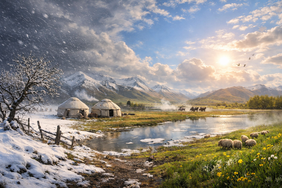 И, пожалуй, в этом есть особая точность. Иногда одно старое выражение объясняет казахстанскую весну лучше, чем длинный прогноз. Потому что в нем уже зашиты и календарь, и страх ошибки, и память о том, что слишком раннему теплу доверять нельзя. Бытует предание, что однажды пятеро беззаботных гостей, радуясь весеннему солнцу, вышли из юрты, чтобы прогуляться.