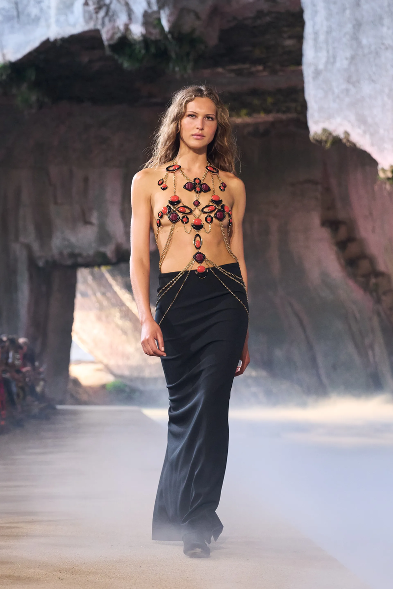Вечером в середине апреля пещера Кордари превратилась в естественную декорацию для показа коллекции под названием «L’Alba» . Это было осознанное решение Камиллы Мичели, креативного директора дома с 2022 года. Она стремилась задействовать пространство, где через верхние и боковые отверстия карьера проникают лучи скользящего света, создавая уникальный сценический эффект, напоминающий первые часы нового дня.