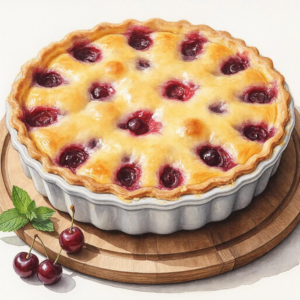 Клафути — это не просто пирог, а нежнейший французский десерт, который одновременно похож и на запеканку, и на блины, и на пирог. И тесто у него в приготовлении очень похоже на блинное. По сути и рецепт очень прост: все смешал, залил в форму и запек. Не нужно вымешивать тесто, возиьтся с мукой, потом все это мыть. И для любителей ленивых десертов это просто находка. Сверху для обсыпки сахарная пудра. 1. Начните с подготовки формы: возьмите круглую стеклянную форму для выпечки и смажьте её сливочным маслом. Присыпьте дно и стенки ложкой сахара - будет та самая хрустящая карамельная корочка, которая так ценится в этом блюде. 2. Вишню тщательно промойте обсушите, если у вас свежая, удалите косточки. Можно брать и просто мороженную вишню без косточек .Разложите ягоды в форму ровным слоем, стараясь не утрамбовывать их слишком плотно. 3. Теперь приготовим тесто: в миске взбейте венчиком яйца с сахаром и ванильным сахаром/ванилином до легкой пышности и побеления массы. 4. Постепенно влейте