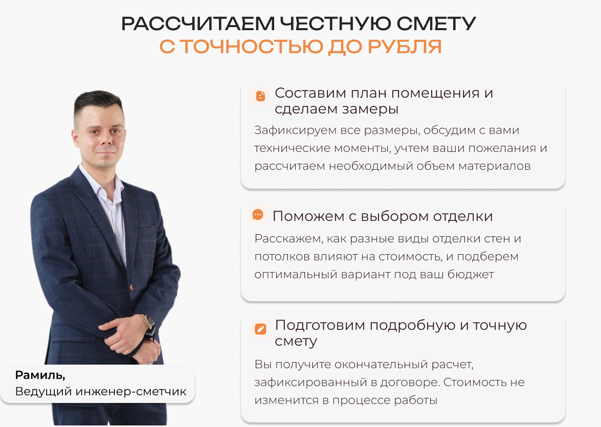 Мы знаем рынок и знаем, где в сметах прячут «допы». В нашей работе это исключено. Вы видите смету до начала работ и понимаете, за что платите.
