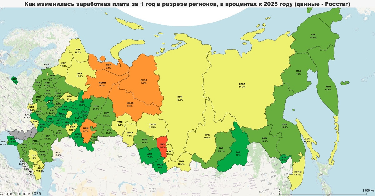 Данные - Росстат. Делал карту сам, на скорую руку (QGIS+Postgres). В среднем по России средняя зарплата выросла за последний год на 14%. Итак, что мы видим? ▪️ Наибольший рост - в Нижегородской области (+19,8%), в Воронежской области (+19%) и в Татарстане (+19%). ▪️ Наименьший рост - в Кемеровской области (Кузбасс), +6,5% за год. Если брать официальную инфляцию, то это фактически единственный регион без роста реальных доходов. Кризис в угольной отрасли, похоже, так сказывается. ▪️ ХМАО, ЯНАО, Коми в "оранжевой" зоне по двум причинам: высокая база, с ней быстро расти уже не получается, а также низкие цены на нефть, не позволяющие хорошо повышать зарплаты в ключевой для этих регионов отрасли. А что с Башкортостаном? Ещё есть карта с ростом зарплат за 5 лет, 2021-2026. Вот там интереснее :) Подписывайтесь, следом опубликую. Если наткнулись на этот пост спустя какое-то время, то заходите в профиль и ищите карту с изменениями за 5 лет.