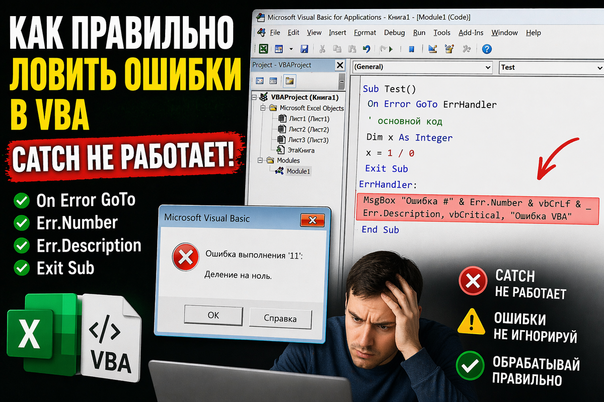 Подробно разбираем обработку ошибок в VBA: почему нет Catch, как использовать On Error, шаблоны и реальные примеры. Вы написали макрос, всё выглядит правильно, нажимаете запуск — и Excel вываливает ошибку. Первая реакция: «Сейчас просто добавлю Catch, как в других языках, и всё будет нормально». Но VBA на это смотрит спокойно и говорит: «Нет». И вот здесь начинается путаница, из-за которой многие либо игнорируют ошибки, либо пишут нестабильный код. Разберёмся, как это работает на самом деле. В языках вроде C#, Java или Python есть привычная конструкция: try → catch → finally Она позволяет: