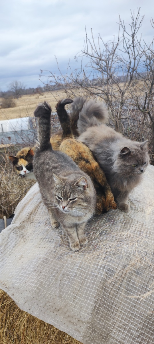 Начну с интересного, пока не забыла. На ночь кошачий дом закрывается. Утром захожу... Что тут случилось? Лежанки, скатерть, подушки на полу. Стул на боку. Тарелки опрокинуты. Кошки рванули на улицу, едва дверь открылась. Кто же