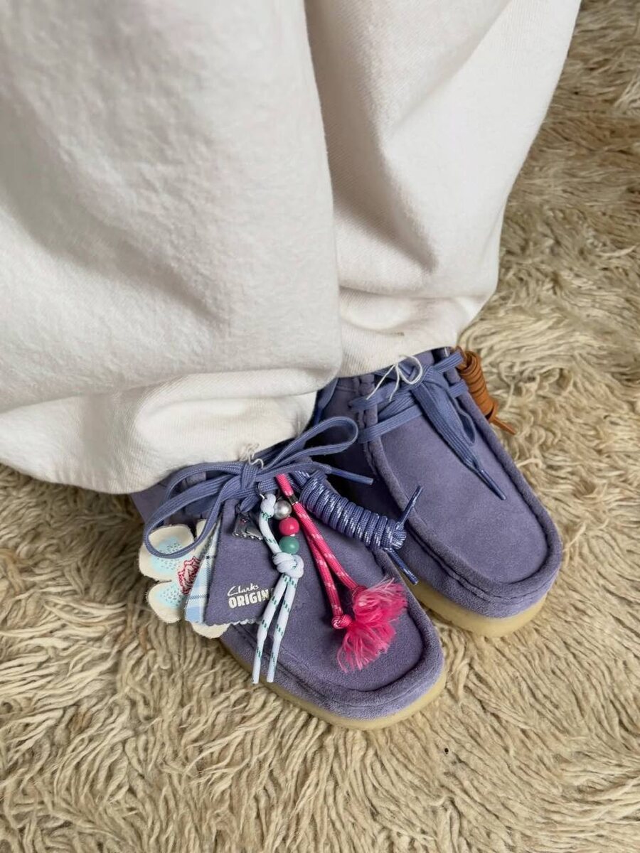 Модель вышла в оттенках Pink & Purple Interest и получила дополнительные элементы для кастомизации: в комплекте идут милейшие чармы, кисточки и бусины. Основа силуэта осталась без изменений: фирменная креповая подошва, верх из премиальной замши и вручную прошитые швы. Как вам такие итерации?