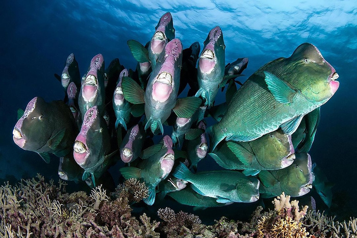 Какие странные рыбины! Они к нам, часом, не с другой планеты пожаловали? Нет, рыбины вполне себе земные и населяют воды Индийского и Тихого океанов. Но зачем же земной рыбине такая странная башка? А дело в том, что шишколобые рыбы-попугаи питаются облепленными водорослями кораллами, веточки которых перед употреблением в пищу разбивают шишками на своих лбах. Отломанные фрагменты немедленно отправляются в пасть-дробилку и с оглушительным хрустом пережёвываются. Не зря же рыбий рот оборудован двумя мощными зубами-пластинами. От известковых наружных скелетов кораллов рыбам толку в плане питательности никакого, и в пищеварительной системе усваиваются только водоросли, которыми те облеплены, да мягкое содержимое полипов. Однако твёрдые осколки и обломки всё же нужны – словно камушки в желудках птиц, они помогают рыбам-попугаям переваривать пищу, работая как жернова, перетирая еду в желудке и облегчая дальнейшее усвоение питательных веществ. Но поработав мельницей, вся эта твёрдая известковая