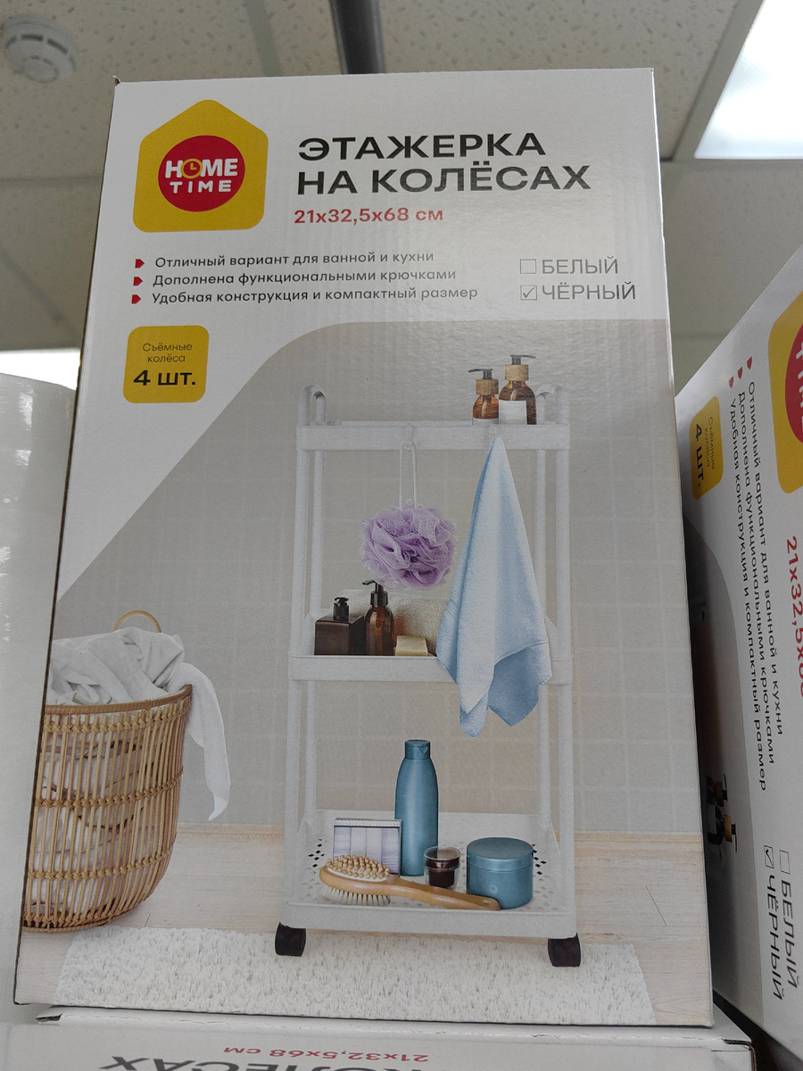 В Фикс Прайс чаще стали привозить крупные новинки для дома, бывают нужны такие, пригодятся. Коробка объёмная, что внутри? Это этажерка, передвижная, с колёсиками. Пластиковая, можно поставить там, где влажный воздух, например, в ванную, ничего ей не будет. Этажерка с тремя полосками, верхняя с ручками - дугами по бокам. Полочки с отверстиями, узором. По высоте этажерка 68 см. Белая или черная. Схема сборки на коробке, ничего сложного. По идее, сбоку на крючки можно закрепить кухонную мелочь, прихватки (если поставить на кухню) или мочалки (если разместить в ванной). Это первое, что в голову пришло. Вариантов много. Можно и крючки отдельно найти, в комплекте всего два. Рядом отдел с головными уборами. Актуально, легкие детские шапочки. Тонкие, легкие, весной пригодятся и летом в прохладную погоду. Много разных, я подумала, что однотонные и без украшений, На деле могут быть с принтом горохом или сердечками, Для мальчиков с буквами и динозаврами. Разом появилось много летних голов