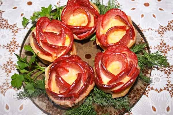 Очень красивое, вкусное и сытное блюдо для праздничного стола розочки из слоеного теста с колбасой. Выпекаются они в силиконовой форме для кексов, но подойдет и любая другая форма. Раскатайте тонко слоеное дрожжевое тесто. Нарежьте на полоски шириной в зависимости от высоты формы с припуском на заворот 2 см. Проколите слегка вилкой. Смажьте полоски соусом или кетчупом тонким слоем. Колбасу нарежьте тонко и выложите веером на полоски по 5 - 6 шт. Верхний край должен выступать за тесто, а нижний не доходить до нижнего края теста примерно 2 см. Натрите сыр на терке и выложите в ряд на нижнюю часть колбасы и теста. Заверните нижний край теста, сформируйте рулетик. Аккуратно переложите в форму, которую не обязательно смазывать маслом, так как тесто и так содержит в себе много жира. Накройте розочки фольгой в 3 слоя, так как колбаса выпекается значительно быстрее, чем тесто. Если розочки не накрыть фольгой, то колбаса или высохнет, или сгорит. Выпекайте при температуре 180 - 200 град
