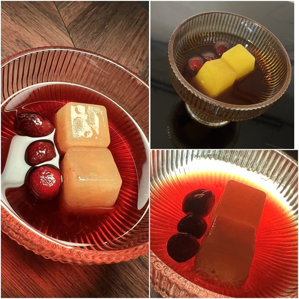 Дополняем двумя кубиками свежевыжатого замороженного апельсинового сока и тремя замороженными вишенками. Подаём в высокой, широкой пиале. Насыщенный сладко-пряный, с ощутимой горечью трав, вкус отлично балансируется кислотой апельсина и вишни. Он, как будто, разделяет первый контакт и послевкусие, давая возможность насладиться отдельно вкусом и ароматом.