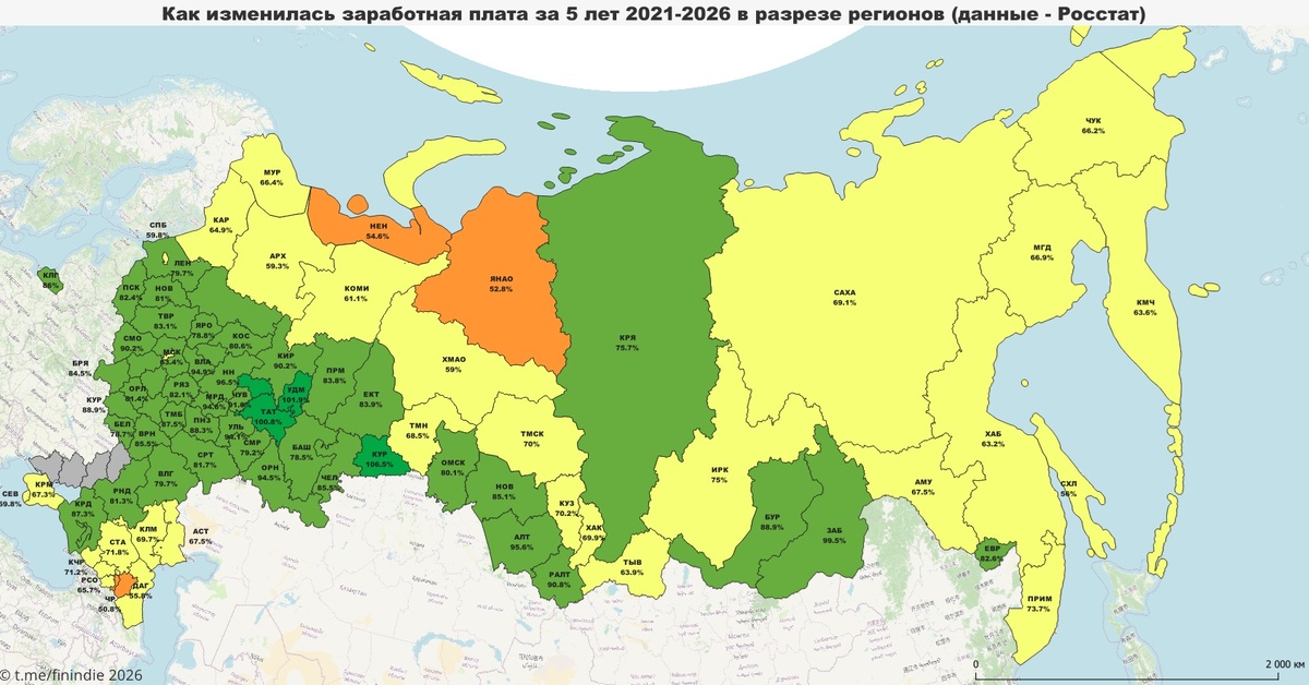 Данные - Росстат. Делал карту сам, на скорую руку (QGIS+Postgres). В среднем по России средняя зарплата выросла за 5 лет на 78% (2021-2026). Вот что получилось: ▪️ Инфляция по Росстату за этот период накопленным итогом составила 53%. Это означает, что в оранжевых регионах реального роста зарплат за 5 лет не было. В желтых тоже реальный рост зарплат невысокий. В зеленых - ситуация получше. ▪️ Средние зарплаты удвоились за 5 лет в следующих регионах: Курганская область, Татарстан, Удмуртия, Марий Эл. ▪️ Нижегородская, Оренбургская, Ульяновская и Владимирская области, а также Мордовия - близки к удвоению (+94...+96%). ▪️ Наименьший рост - в Ингушетии (+43,6%). Татары, Удмурты, Марийцы и Курганцы - вам там как вообще, нормально? На Мальдивы с таким ростом доходов вы 2 или 3 раза в году летаете?