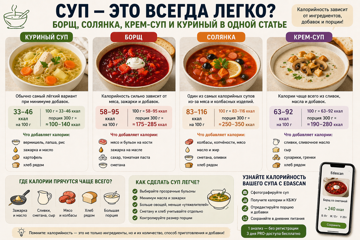 А потом внезапно выясняется: один суп — это 150–250 ккал за тарелку, а другой (при тех же “это же просто суп”) — 500+, особенно если рядом хлеб и ложка сметаны.