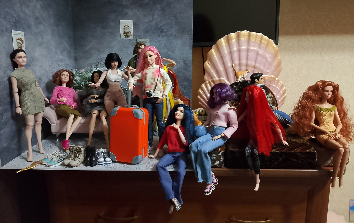 Иви с Бертой смеются, Люся просто таращится на чемодан)