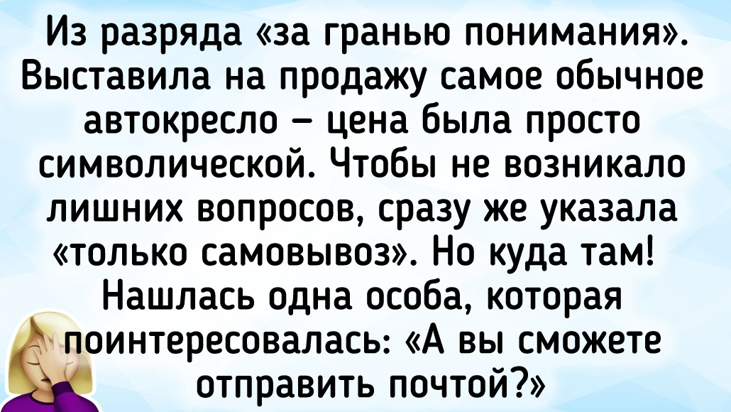 Из разряда «за гранью понимания». Выставила на продажу самое обычное автокресло — цена была просто символической. Чтобы не возникало лишних вопросов, сразу же указала «только самовывоз». Но куда там! Нашлась одна особа, которая поинтересовалась: «А вы сможете отправить почтой?» © Svetlanych / ADME