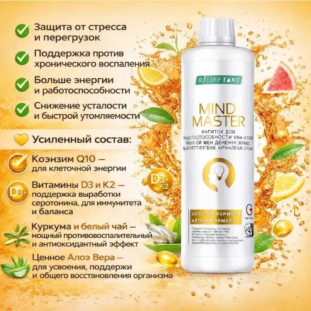 »❓ Майнд Мастер «Золотая формула» — новинка в линейке Майнд Мастер, которая, как и другие продукты Майнд Мастер, способствует выработке энергии, работоспособности и производительности. Входящий в состав продукта витамин Е, защищает организм от оксидативного стресса, а витамин В12 важен для поддержания энергичности и работоспособности. Железо в составе продукта способствует нормальной когнитивной функции. Таким образом, этот напиток снабжает организм ценными питательными веществами, оказывающими позитивное влияние на состояние психики. Кроме того, формула содержит так называемый солнечный витамин D. В чем преимущества Майнд Мастер «Золотая формула»❓ Новинка содержит новые ингредиенты, такие как витамин D и витамин К, а также куркуму и белый чай. В новую рецептуру также включено большее количество коэнзима Q10. Это веганский напиток с приятным свежим фруктовым вкусом. Продукт запатентован в Германии (патент № 10 2023 123 064.6). За счет чего Майнд Мастер «Золотая формула» имеет