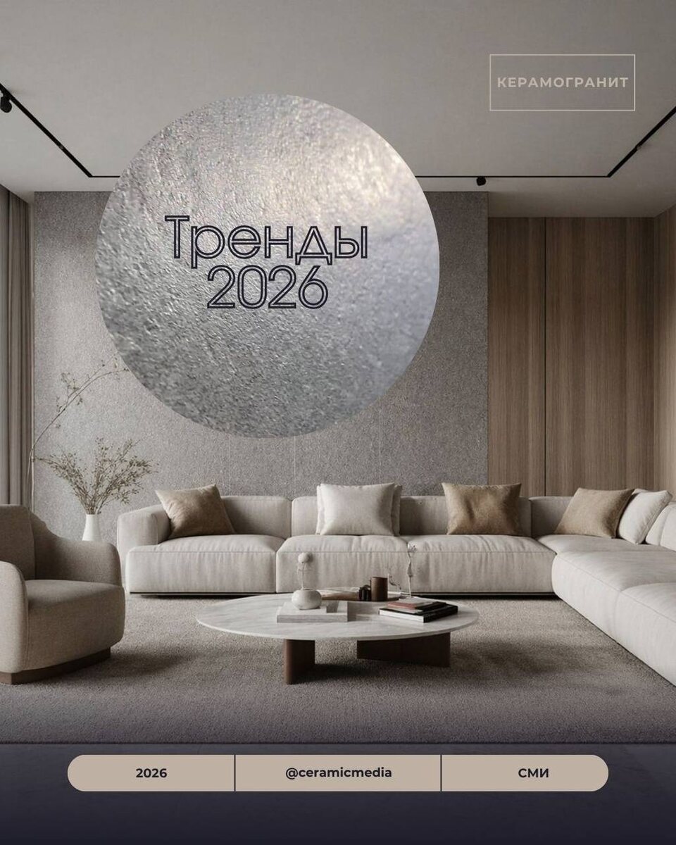 керамогранит. В 2026 году керамогранит с текстурой, напоминающей натуральный камень, становится одним из главных трендов в дизайне интерьеров. Вот основные характеристики и направления, которые стоит учитывать: Часть 1. Камень серый - Цветовая палитра: Основной цвет серый, с переходами от тёмно-серого к светло-серому. В моде также теплые оттенки серого с бежевым или песочным подтоном, а также графитовые и дымчатые поверхности. Это создаёт ощущение объёма и текстуры, делая интерьер более живым и уютным. - Текстура: Поверхность керамогранита имеет мелкую зернистую структуру, напоминающую шероховатый натуральный камень. Она неоднородна, с видимыми точечными включениями разных оттенков, что придаёт материалу естественный вид. В тренде также матовые и лаппатированные поверхности, которые выглядят более естественно и могут создавать ощущения небольшого глянца - Форматы плит: Крупноформатные плиты (120×60 см) остаются популярными. Они позволяют минимизировать количество швов и создать эф