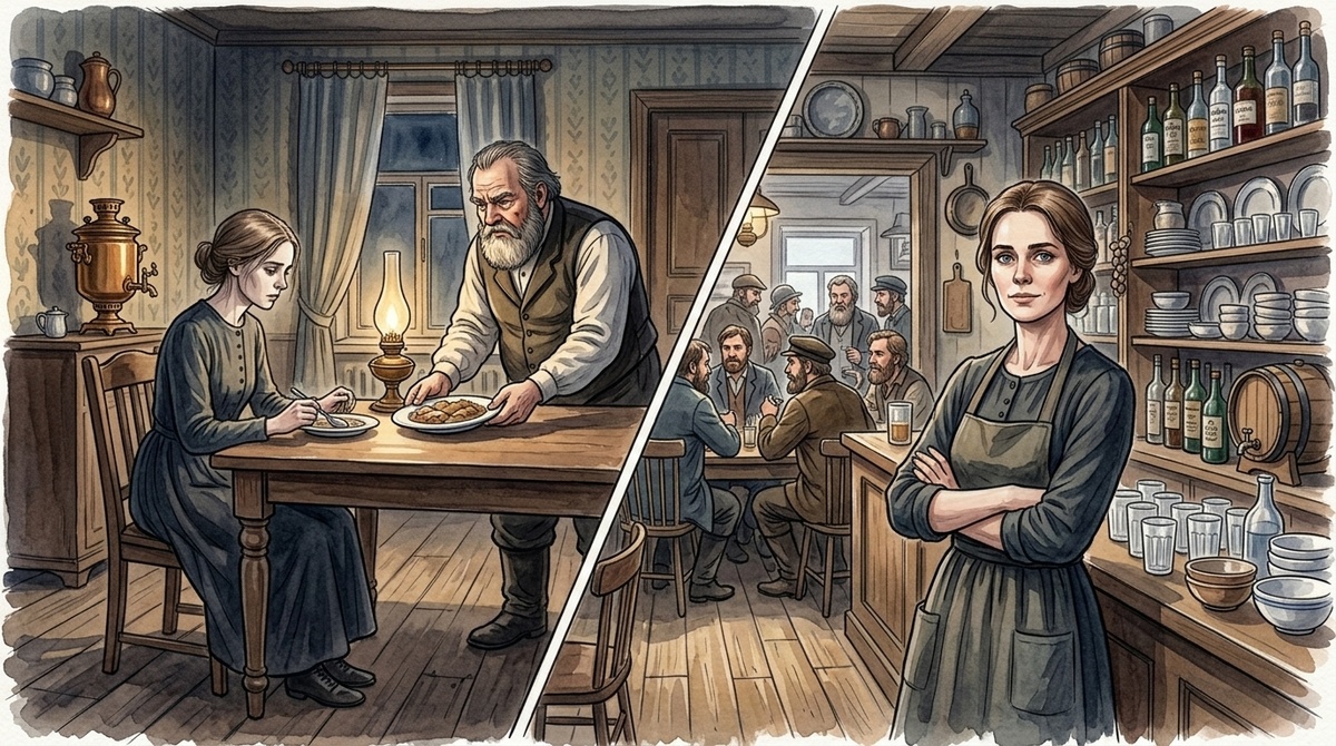 Осталась работать на том же постоялом дворе — сначала судомойкой, потом за стойкой. Хозяин был не злой, но дело вёл кое-как. Глаша навела порядок в кладовке, наладила учет. Хозяин удивился и поднял ей жалованье.