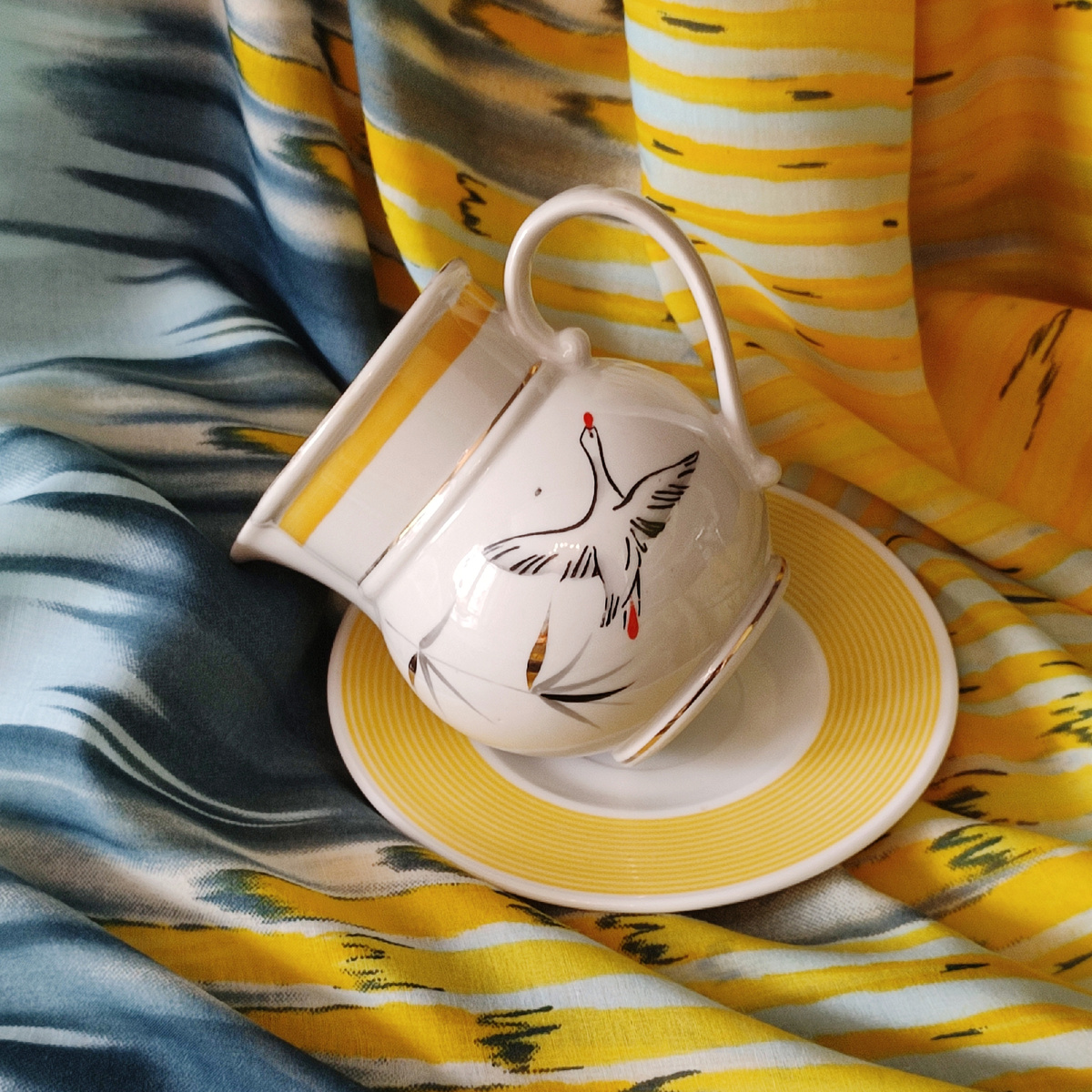 Декор - летящие гуси и ветки-травинки. На лицевой и тыльной стороне гуси в разных ракурсах. Цвет росписи (ручная?) серо-черная, у гусей красные клювы и лапы. По верху молочника широкая желтая полоса. Немного золота на листьях и отводке.