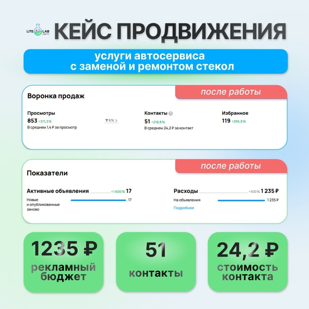 Агентство LiteLab Аgency - мы помогаем бизнесу увеличивать продажи на Авито. За последний год наша команда работала с 50+ различными нишами: в товарах, услугах, вакансиях.