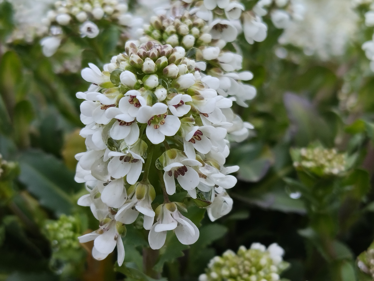 И только посмотрите на эти цветы! Милейшее соцветие: белоснежные цветки в 4 лепестка (Крестоцветное же) с пурпурными тычинками, цветущее снизу, а сверху - нежные, пурпурно-розовые бутончики.