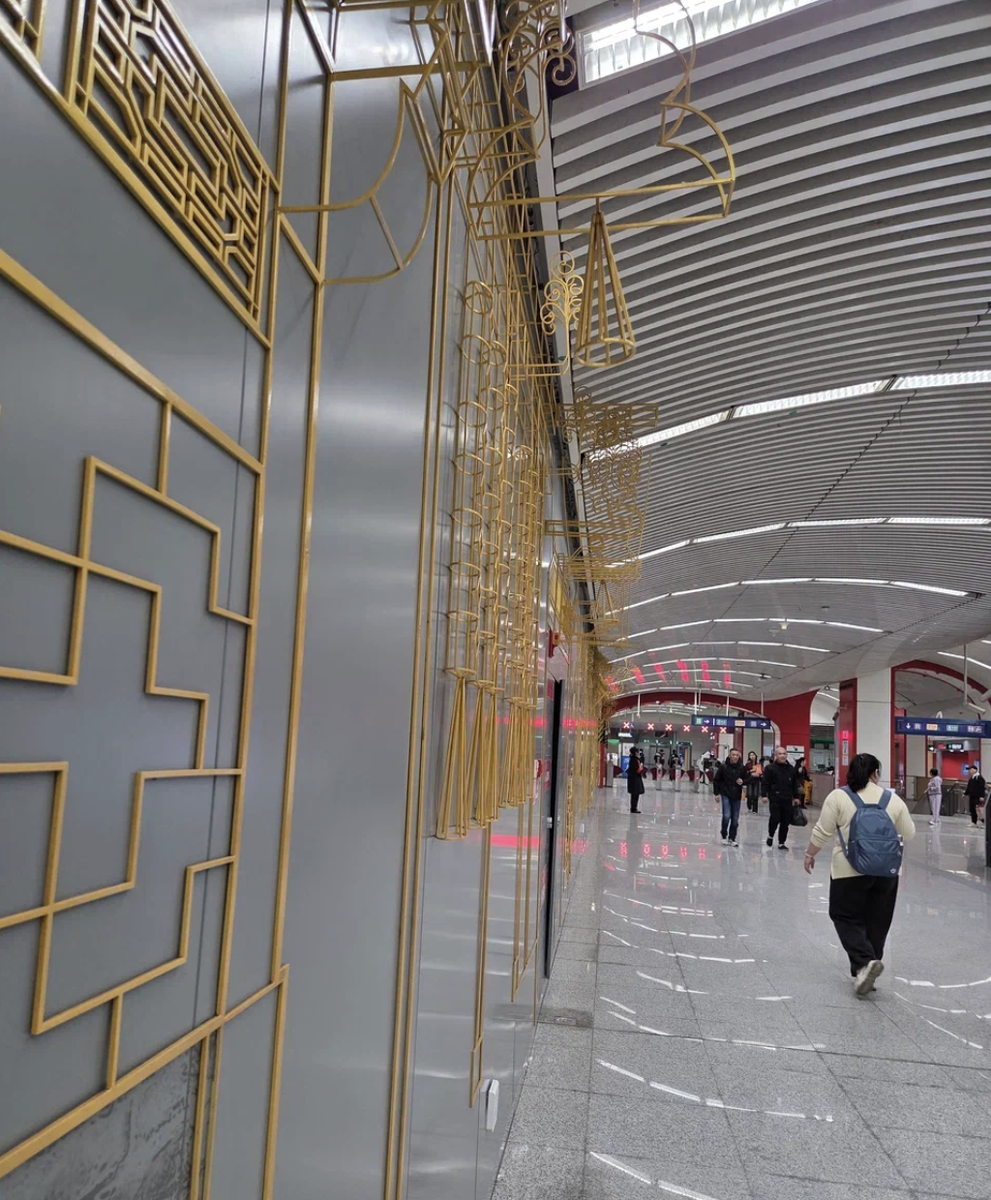 Пекинские станции метро на первый взгляд довольно однообразны, во всяком случае те, через которые ездила я. Но это только до того, как появится минутка немного задержаться и обратить внимание на что-то кроме направляющих табличек. И тогда окажется, что станции метро украшены творениями китайских художников, так что побывать на них - это то же самое, что побывать в музее. Причем к произведениям искусства приложены таблички, на которых можно прочитать информацию про автора и само произведение, так что ощущение музея полное. Давайте пройдемся по некоторым из них. Станция Zhushikou, выход А на линии 7, которая изображается персиковым цветом на схеме метро. Ох и не завидую я дальтоникам, ведь в пекинском метро более 30 линий, и каждую из них нужно покрасить в какой -нибудь цвет! Так что женщины в пекинском метро имеют большое преимущество! На станции Zhushikou стены украшены элегантными золотистыми линиями на сером фоне стены. Но это не просто линии - они слагаются в рисунки: Мы видим
