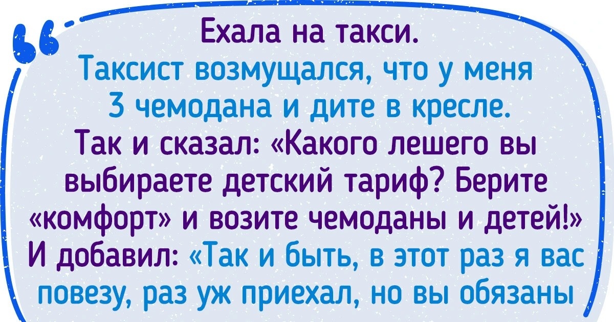 Ехала на такси. Таксист возмущался, что у меня 3 чемодана и дите в кресле. Так и сказал: «Какого лешего вы выбираете детский тариф? Берите „комфорт“ и возите чемоданы и детей!» И добавил: «Так и быть, в этот раз я вас повезу, раз уж приехал, но вы обязаны докинуть мне на чай до стоимости „комфорта“!» © iscelenie70 / Pikabu