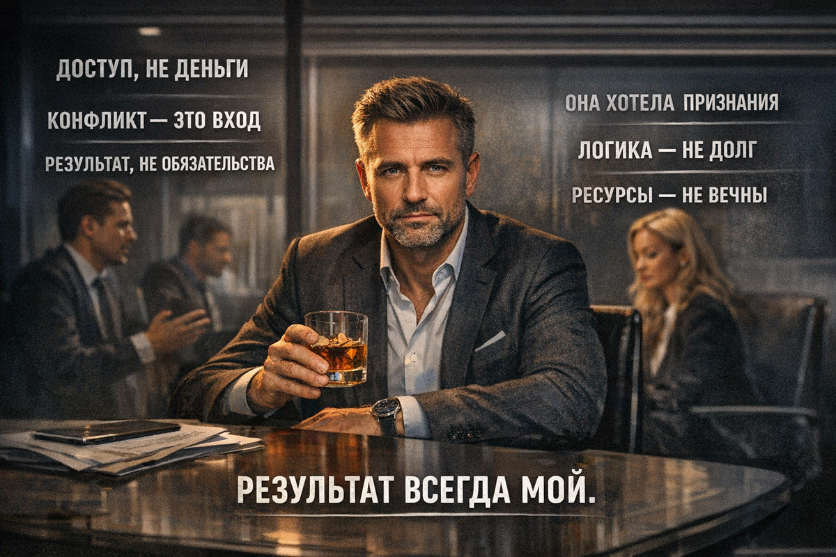 И вот здесь происходит самое важное. Ты начинаешь играть по его логике. Где нет долга — есть процесс. Где нет обязательств — есть приоритеты. Где нет обмана — есть «не совпали ожидания». И чем сильнее ты сам, тем дольше ты в этом остаёшься. Потому что сильные люди не любят признавать, что их обвели вокруг пальца. Они ищут ошибку в себе. Они докручивают. Они пытаются довести до правильного. А правильного там нет. Потому что в этой системе координат результат всегда принадлежит одному человеку. А все остальные — это просто этап.