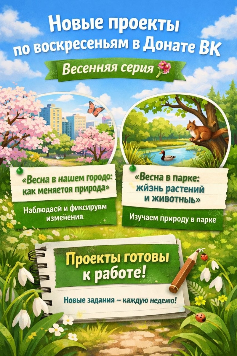 В рубрике "Лаборатории проектов" для участников ВК Донат опубликована весенняя серия проектов: 📍 «Весна в нашем городе: как меняется природа» Наблюдаем, фиксируем изменения, учимся замечать детали вокруг. 📍 «Весна в парке: жизнь растений и животных» Про исследование природы через реальные наблюдения — что происходит с растениями и животными весной. Проекты уже готовы к работе — можно брать и проводить без долгой подготовки. Новые проекты добавляются каждую неделю👌 Подключиться к программе "Донат-ВКонтакте": vk.com/donut/shkolaproektov В рубрике: ✅ Готовые идеи для проектной деятельности ✅ Описание проблем, целей и задач ✅ Этапы реализации и возможные продукты ✅ Примеры для вдохновения и адаптации под свой класс Проекты подойдут: — учителям, которые ищут свежие подходы — школьникам, которым нужна структура и идея — родителям, которые хотят помочь с проектом 📌 Каждый выпуск — это небольшой, но продуманный конструктор, с которым легко начать проект.