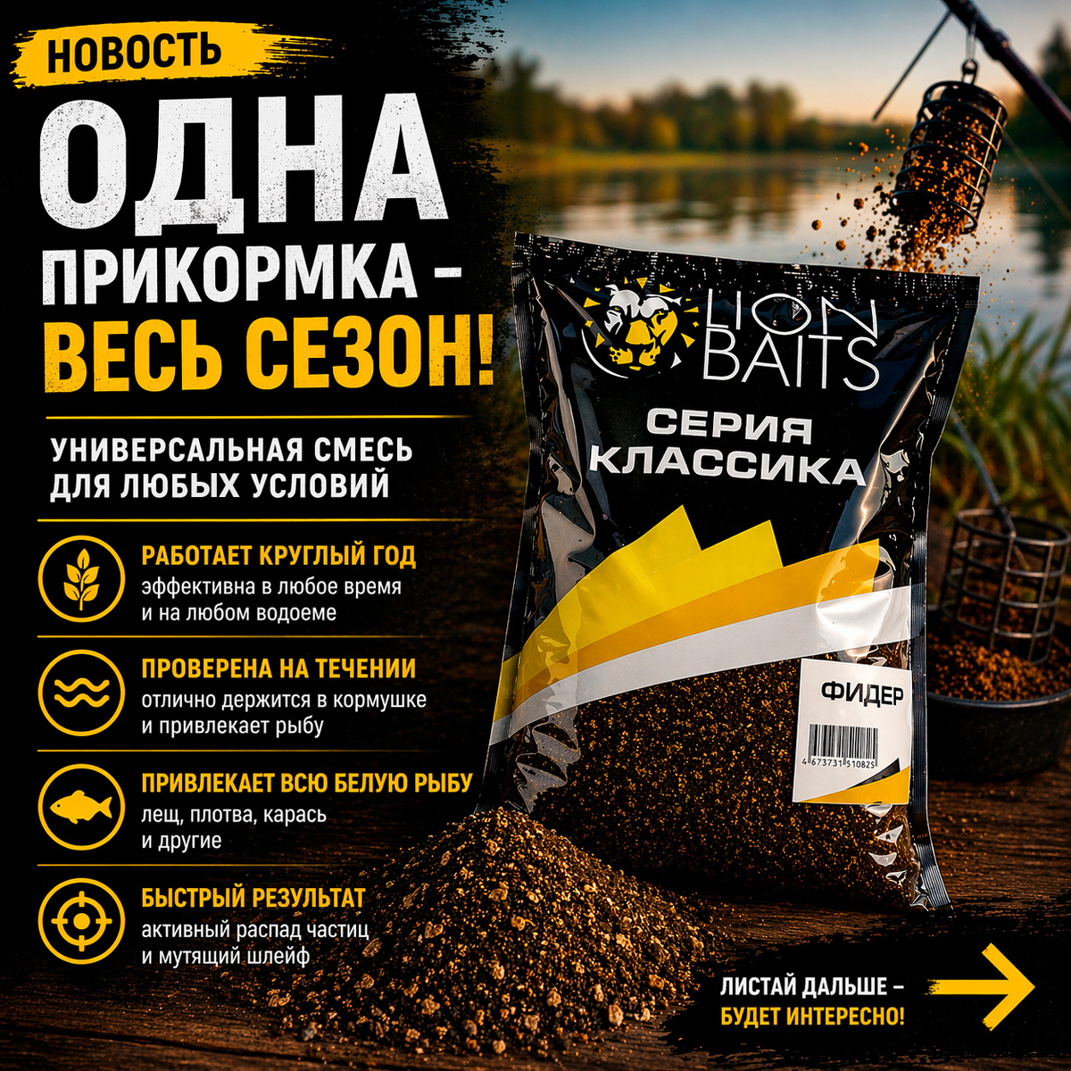 🎣 Одна прикормка — весь сезон! Пока другие меняют смеси под погоду и водоем, опытные фидеристы выбирают универсальное решение. LION BAITS "Фидер" работает круглый год и помогает быстро собрать рыбу в точке. Но главный секрет — дальше... 🟡 Секрет, который скрыт в каждой грануле. Главная сила смеси — экструдированные компоненты. Они быстрее раскрываются в воде, дольше держат аромат и активнее собирают рыбу с дистанции. Именно поэтому прикормка работает заметно увереннее обычных составов. 🍮 Аромат, мимо которого рыба не пройдет. Карамель, бисквит, ваниль и корица создают мощный сладкий шлейф. Такой аромат быстро расходится по воде и удерживает рыбу в точке дольше. Именно здесь начинаются частые поклевки. 🚀 Быстрый старт после первого заброса. Смесь активно распадается сразу после попадания в воду. Частицы создают заметное облако мути и быстро собирают рыбу в точке. Именно поэтому первые поклевки часто случаются быстрее ожидаемого. 💰 Универсальность, которая экономит время и деньги. О