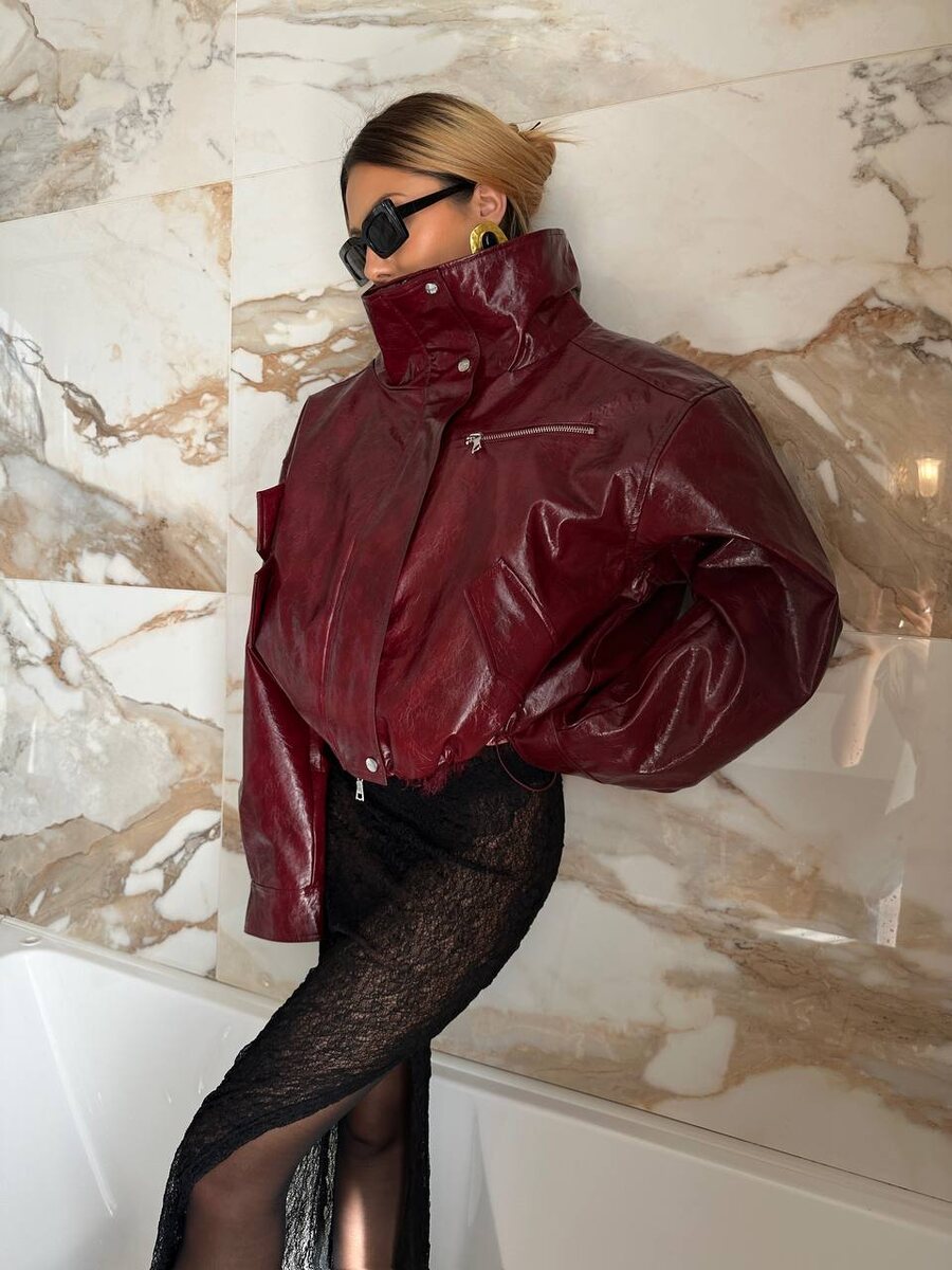 Шикарный образ от основательницы бренда Нигины - платье из эластичного кружева и лакированная куртка в бордовом оттенке