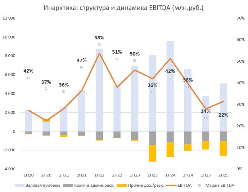 Отчет Инарктики за 2025 - ждать ли улучшений? В 2024 году компания столкнулась с мором рыбы, в результате в 2025 году объем рыбы для продажи сократился (на конец 2023 биоресурсы составляли 34 тыс.тонн, на середину 2024 уже 15.6, а на конец 2024 немного восстановились до 22.6). Средняя цена реализации упала в 2025 году (1067 руб/кг против 1192 в 2024). Как следствие, выручка упала на 22%. Cнизилась и маржинальность из-за роста издержек - 22% по EBITDA против среднеисторических 44%. Даже несмотря на восстановление биоресурсов до 30 тыс.т к концу 2025, их переоценка в отчетности по итогам года все равно оказалась отрицательной из-за падения цен. Цены были под давлением из-за импорта (при том, что мировые цены на рыбу также снижались в 2025) и крепкого рубля, и эти факторы пока сохраняются, как минимум в 1 полугодии 2026. 💡 Между тем, в 2026 году в продажу пойдет рыба, запущенная уже после случившегося мора, то есть объем физически будет больше, что позволяет ожидать восстановления выр