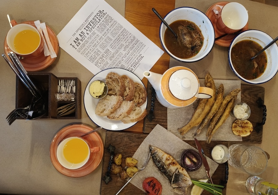 Под корюшку и щи на копченых ребрышках мы 1,5 часа говорили про инвестиции. 1) Первым делом мы разобрали письмо моего читателя Игоря, который всего за 1 год мощно вошел в инвестиционный процесс. Хотя инвестировать он начал с довольно-таки большим запозданием (в 59 лет). Как говорится, Дай Бог ему здоровья и долгих лет жизни. А инвестиции помогут ему хорошо себя чувствовать в финансовом плане. * На фото кусочек нашего стола на сегодняшнем "Завтраке инвестора" 2) После того, как мы порадовались за Игоря, мы переключились на разбор инвест.стратегии, разработанной одним из ведущих российских брокеров. Стратегия очень толстая (напечатанная на огромном количестве страниц), но вот её содержание … мягко говоря… «так себе». На новичков такая груда (испачканных) листов окажет неизгладимое впечатление, но если они начнут придерживаться изложенного там подхода – то плакали их денежки (= убытки и разочарование). 3) Я в свое время в телефонном разговоре с очередным фин.консультантом, которая звони